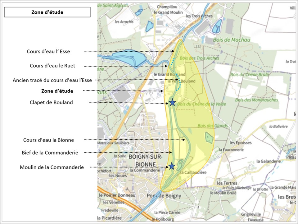Le site dit de « Bouland » est une zone complexe avec son bief, son moulin, son cours d’eau, des mares, des étangs, des résurgences de la nappe de Beauce, des zones humides et d’expansion de crues, des anciens tracés de lit de la Bionne.