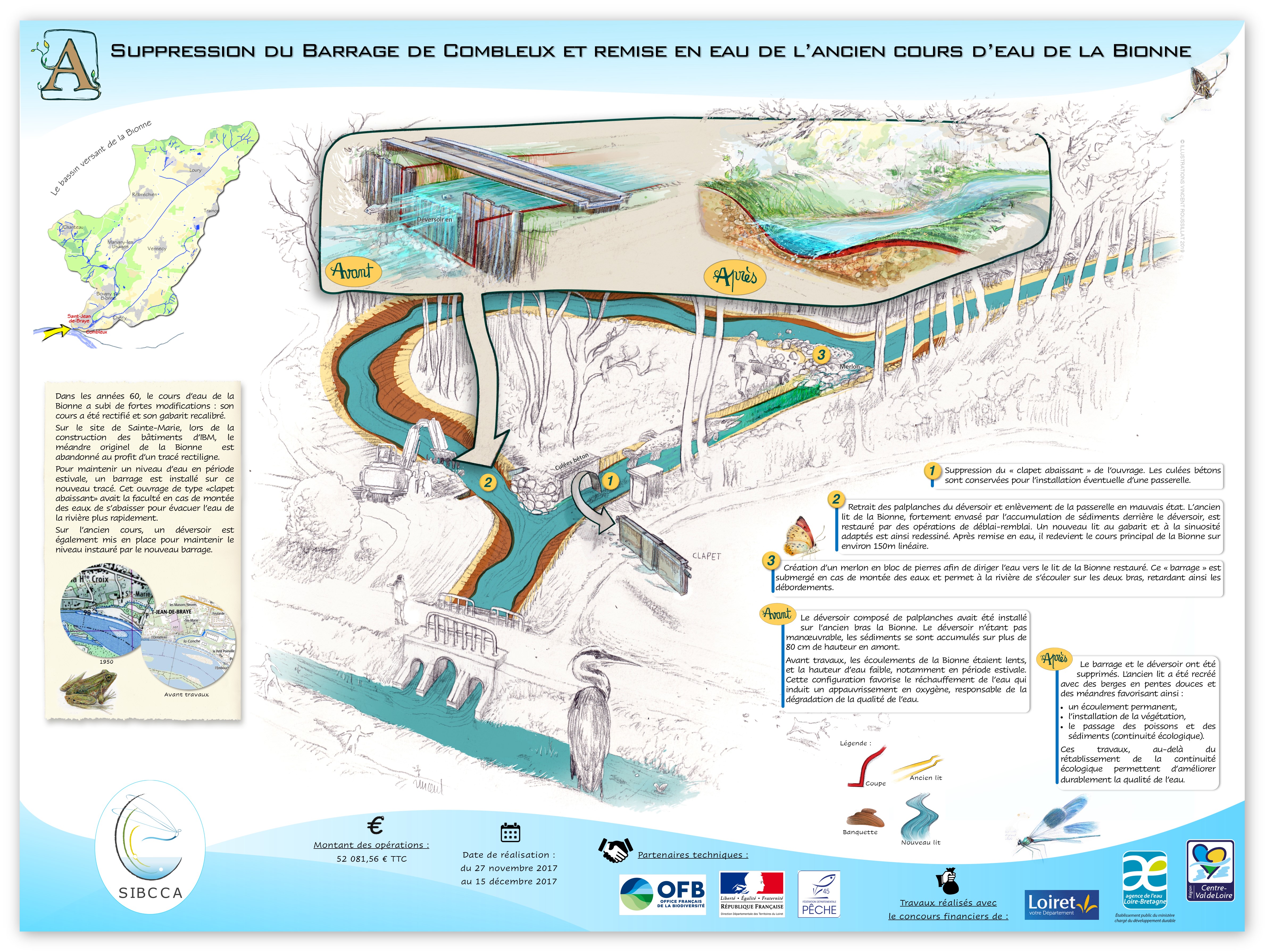 La restauration du cours d’eau a débuté en 2017 par la suppression des barrages et la restauration du lit mineur. Ces travaux ont permis de restaurer plus de 7 kilomètres du cours d’eau et supprimer six des sept barrages.